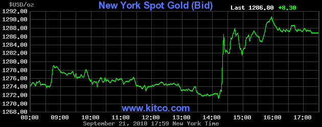 Dienstag, 21. September 2010 , von Freeman um 23:00 Ab 14:30 Uhr Lokalzeit in New York durchbrach der Goldpreis alle Rekorde und ging über 1'290 Dollar die Unze. Der Silberpreis machte den gleich Sprung.
