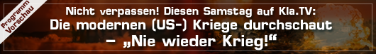 Programmtipp: 23. April 2016 Am kommenden Samstag zeigt Kla.TV den Dokumentarfilm „Die modernen (US-) Kriege durchschaut – „Nie wieder Krieg!“ Darin wird gründlich aufgezeigt, dass es den US-Strategen und deren Drahtziehern keineswegs darum geht, Völker von angeblichen Diktatoren zu befreien. Es sollen vielmehr aufstrebende und geostrategisch bedeutende Länder destabilisiert werden. Und das geschieht immer nach demselben Ablauf!