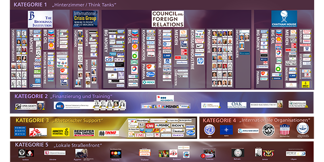 Dritte Anmerkung: Die Wechsel der Zielsetzungen wurden von den Mächten, zu deren Lasten sie gingen, zwangsläufig abgelehnt: vom Katar in Bezug auf die energiepolitischen Fragen und von den Muslimbrüdern aufgrund des Regimesturzes. Nun werden diese Akteure von einer mächtigen Lobby in den USA unterstützt: Exxon-Mobil – der weltweit bedeutendste multinationale Konzern – und die Familie Rockfeller für den Katar, die CIA und das Pentagon für die Muslimbrüder.