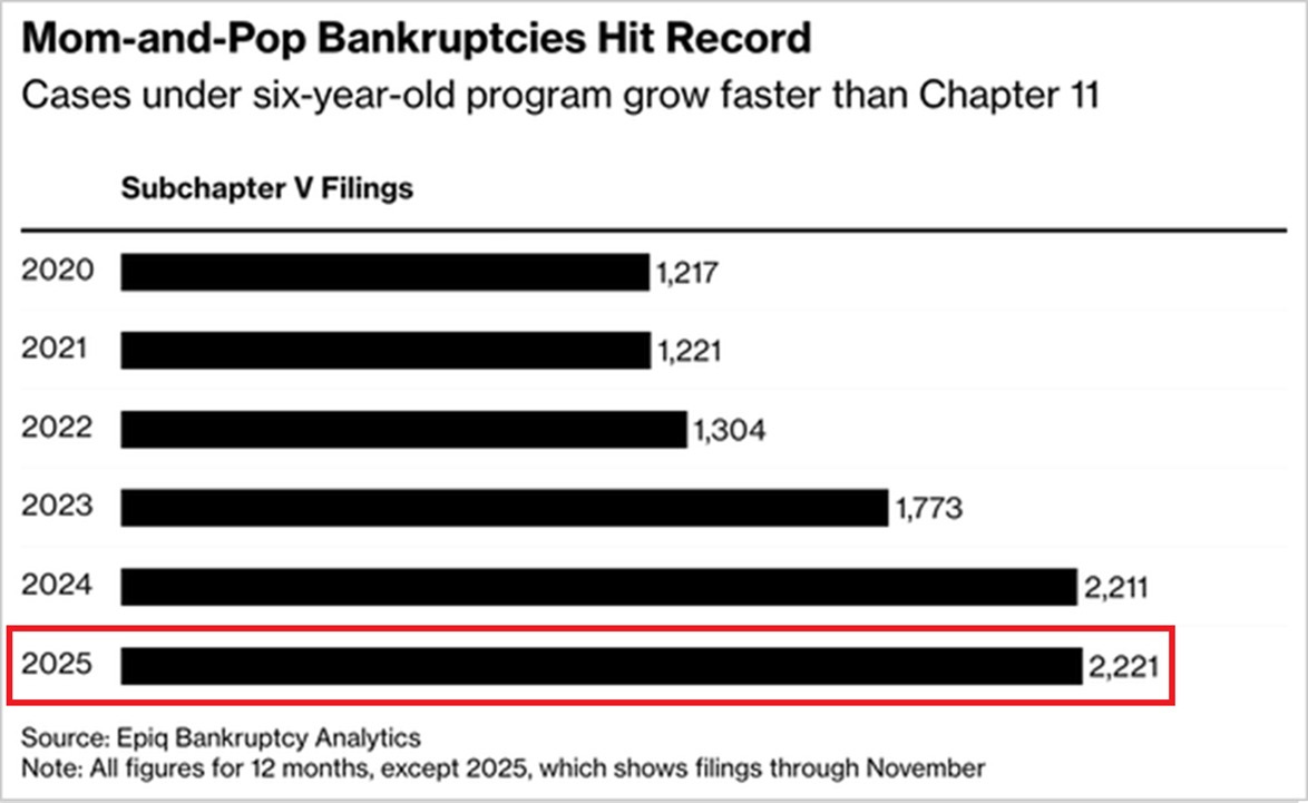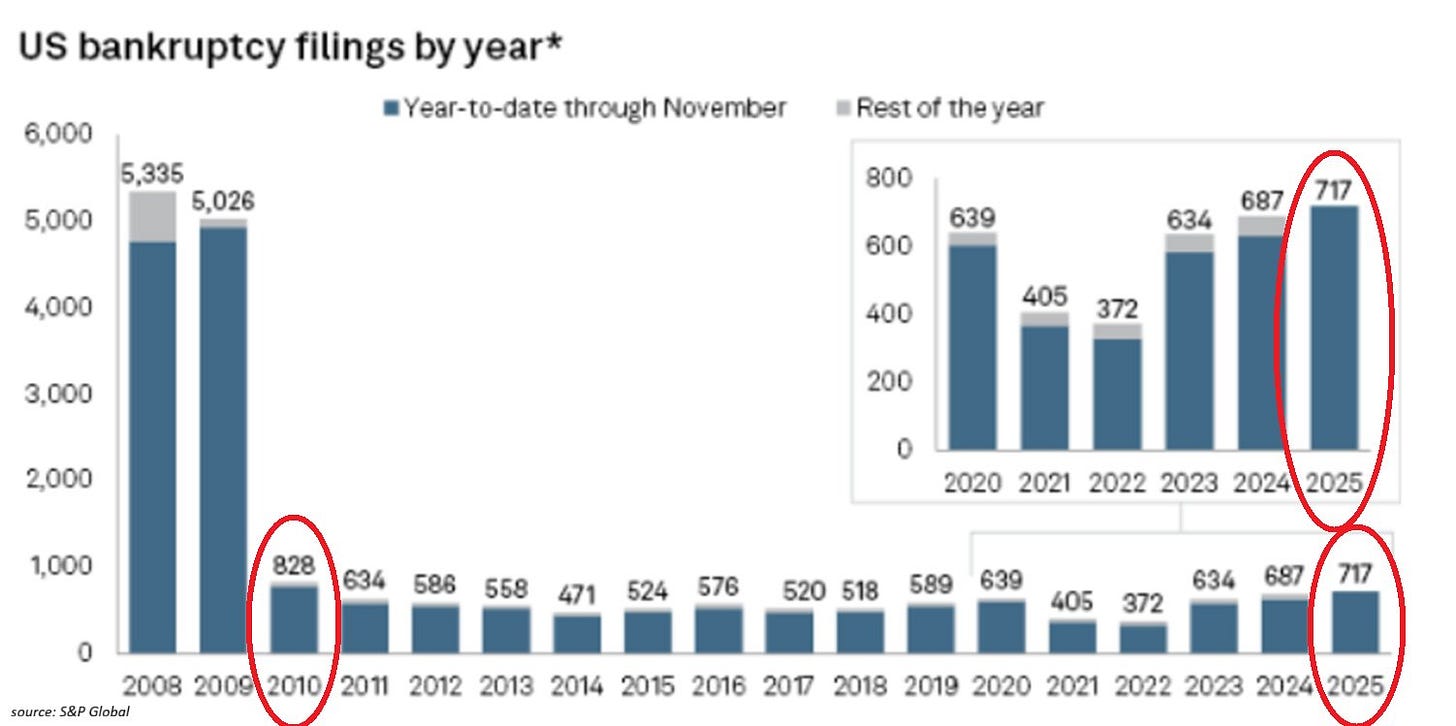 Wie wir sehen, gab es unter großen Unternehmen im Jahr 2025 die höchste Zahl an Insolvenzen seit 2010 (und das ohne die Dezemberzahlen). Dasselbe gilt für kleine und mittelständische Unternehmen: