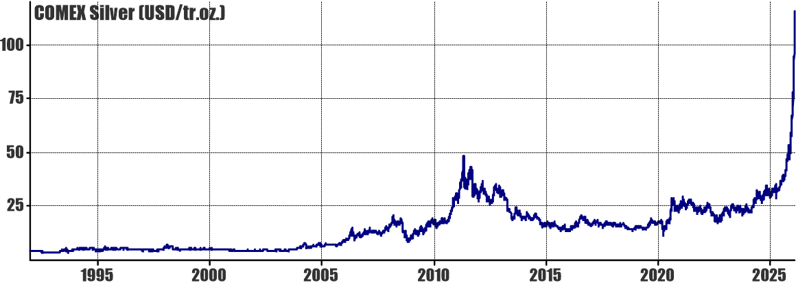 Während der Handelssitzung am Freitag fiel Silber um 32 % – der größte Ein-Tages-Crash seit 46 Jahren (der bisher größte je in USD/tr.oz.). Am Donnerstag, den 29. Januar, schlossen die Silber-Futures (Lieferung im März 2026) bei 115,50 $/tr.oz. Die Sitzung am Freitag schloss bei 78,53 $ (ein Rückgang von 36,97 $ pro Tr.Oz. in 24 Stunden). Aber selbst damit lag die Performance von Silber im gesamten Januar immer noch bei +11,23 %!
