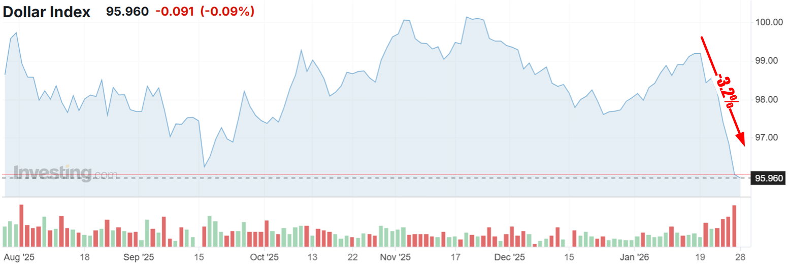 28. Januar 2026: Hat die Bank of Japan den Dollar zum Absturz gebracht? - In den letzten neun Tagen brach der US-Dollar-Index zusammen: Am 19. Januar schloss der Index bei 99,16. Heute handelt er unter 96 – ein Rückgang von 3,2 %! Das klingt vielleicht nicht nach viel, aber was die Devisenmärkte betrifft, ist es ein sehr bedeutender Schritt: