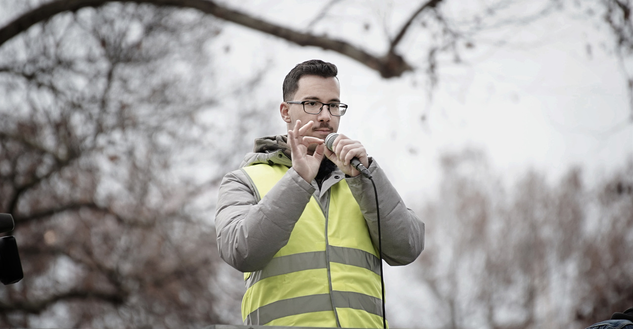 Prolo-Charme mit Oberlippenbart: Jannis Sakkaros, das Gesicht der Stuttgarter Gelbwesten. Foto: SvM/COMPACT