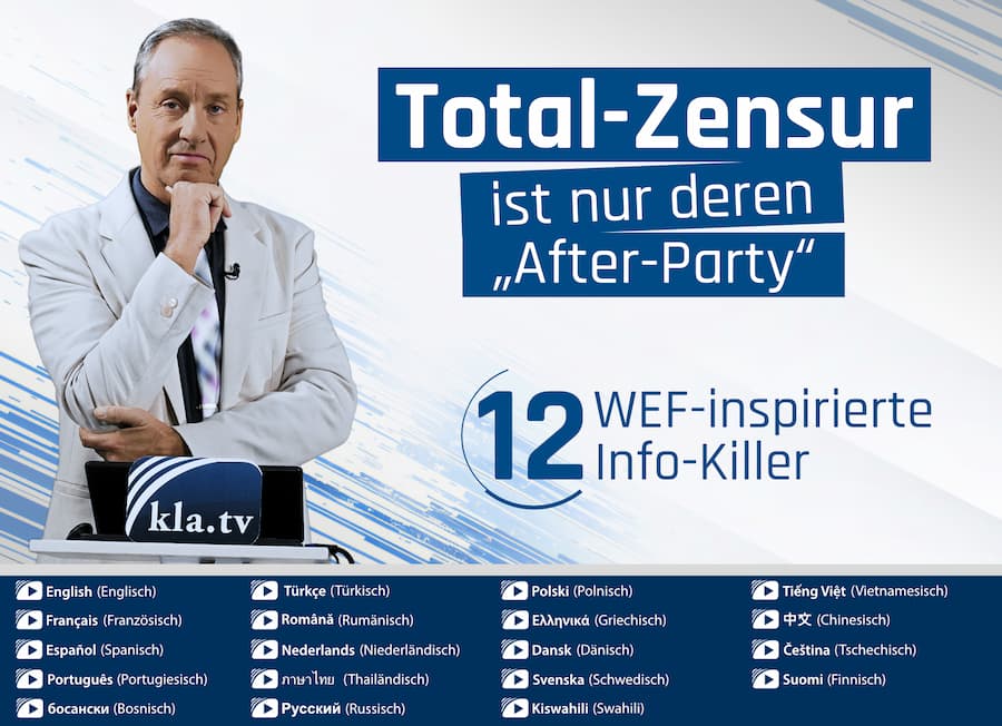 Liebe Kla.TV-Zuschauer! Am 54. Jahrestag des WEF hatte Ursula von der Leyen den radikalen Kampf gegen die Desinformation auszurufen. Was seit diesem Schlachtruf der „Geheimbündler“ gegen die freie Wahrheitsbewegung abgeht, ist ätzender als etwa die gefürchtete Totalzensur selbst. In dieser Schulung dokumentiert Kla.TV-Gründer Ivo Sasek daher nicht nur WEF‘s neueste Infokiller, sondern zeigt der Menschheit auf, wieso eine Totalzensur bei der selbsternannten Elite erst als Nachspeise auf dem Plan steht. 54:45 min www.kla.tv/30846 Bildung UNZENSIERT #Medien #Medienzensur #IvoSasek In den aktuellen Wirren der Zeit sind diese Worte von Ivo Sasek, die jedem Wahrheitskämpfer Licht und Durchblick geben, kostbarer als teuerste Edeltsteine. 👉Streuen Sie deshalb mit uns gemeinsam diese Herzlichsten Dank! 4:55 min www.kla.tv/30932 Meinung ungeschminkt #Klima #Wetter #Manipulation