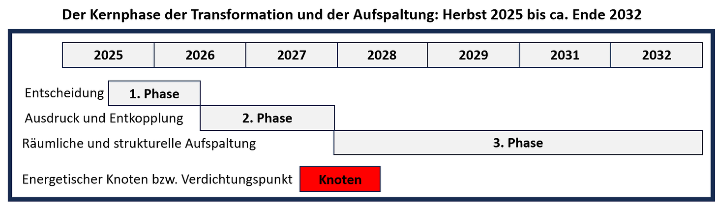 Phase 3 - 2028–2032: Die extreme Polarisierung und Aufspaltung der Menschheit ist nun für alle sichtbar, und ihre Auswirkungen betreffen alle Lebensbereiche. Auf der Erde beginnen sich sichtbar zwei unterschiedliche Welten zu manifestieren. Es bilden sich neue Wirtschaftssysteme und Lieferketten, und es entstehen neue Gemeinschaften mit eigener Kultur und eigenen Lebensstilen. Alte bürokratische, gesellschaftliche, wirtschaftliche und (geo)politische Strukturen lösen sich auf. Die Spaltung der Welt ist nun unumkehrbar.