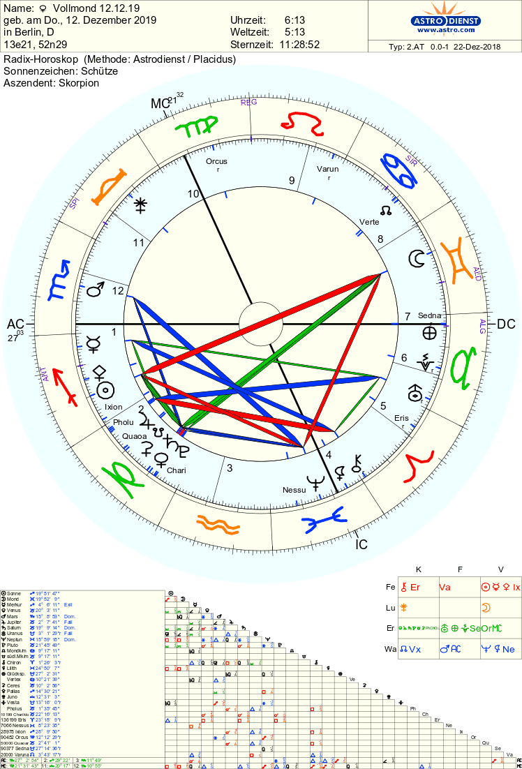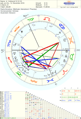 Im Vollmond geht es um kollektive Altlasten, deren Träger wir noch sind (Skorpion-AC), um Ängste, die sich auf die Sicherheit und die Grenzen beziehen, und ein mangelnder Selbstwert, weil unser Lebensraum bedroht ist und sich zuviel in unsere Angelegenheiten eingemischt wird (Pluto H1 in 2). Weiter geht es um falsche Wahrheiten, die uns in Bezug auf Werte und Grenzen vermittelt werden, wie auch um das Handeln der Geheimdienste (Pluto H12 in 2, Mars in 12). Dabei werden die Beziehungen wichtig, persönlich wie in der Diplomatie, wobei der Bogen auch schon mal überspannt werden kann (Vollmond Schütze-Zwilling in Haus 1 + 7), und auf beiden Seiten Enttäuschung, Entwürdigung und Konkurrenz eine Rolle spielen (Vollmond Qu. Neptun). „Wir müssen reden“, sagt Merkur in 1, wobei jeder seine Interessen wahren sollte. Es geht nun um viel, denn die Fremdbestimmung wird immer offensichtlicher, auch im Finanzbereich (Pluto Konj. Saturn in 2), denn dort gibt es Übergriffe auf unser Vermögen (so denn vorhanden). Erinnern wir uns, in 2012 trat der damalige Finanzminister Schäuble die Hoheit über die Finanzen an den ESM ab, also hat der Bundestag keine Befugnis mehr, und wir letztendlich auch nicht. So könnte jetzt einerseits unsere finanzielle Freiheit stark eingeschränkt werden oder wir müssen Verluste hinnehmen (Venus H11 Konj. Saturn am 11.12., Konj. Pluto am 13.12.), aber es spielen noch andere Dinge eine Rolle.