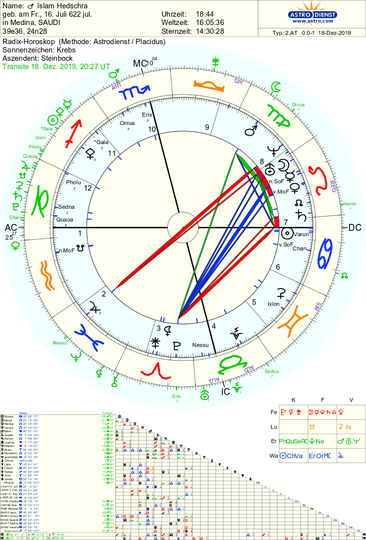 Saturn-Pluto-Konjunktion am 12.01., über die ich im September ausführlich berichtete, steht nicht nur am IC der BRD-Gründung und könnte hier alles lahm legen, sondern sie bewegt sich auch über den AC der Hedschra (Beginn des Islam). Genauer gesagt, zuerst Saturn (1. Februarwoche), und damit kommt der Wille zur Beherrschung anderer (Saturn H1 in 7) in die Realität. Pluto folgt später (letzte Februarwoche bis Juni), d.h. er bleibt die ganze Zeit 1° vor dem AC stehen, dürfte aber dennoch wirken, und zwar in Richtung von oben gelenkter Propaganda und Überzeugung. Dabei besteht ein generelles Problem des Islam, weil diese Religion militärisch organisiert ist, und bei ‚Bedarf‘ auch mal gewaltsam vorgeht (Mars SP-Opp. Pluto). Trotzdem kann sich hier auch ein zeitlicher Spielraum ergeben, zumal es sich um sehr alte Zeitangaben handelt. Doch die Zeit wurde so überliefert (Quelle: „Das Buch der Welthoroskope“ von Nicholas Campion), als Mohammed in Medina einmarschierte und den Islam verkündete, auch der julianische Kalender wurde berücksichtigt. Wir werden sehen, wie genau dieses Horoskop wirkt.