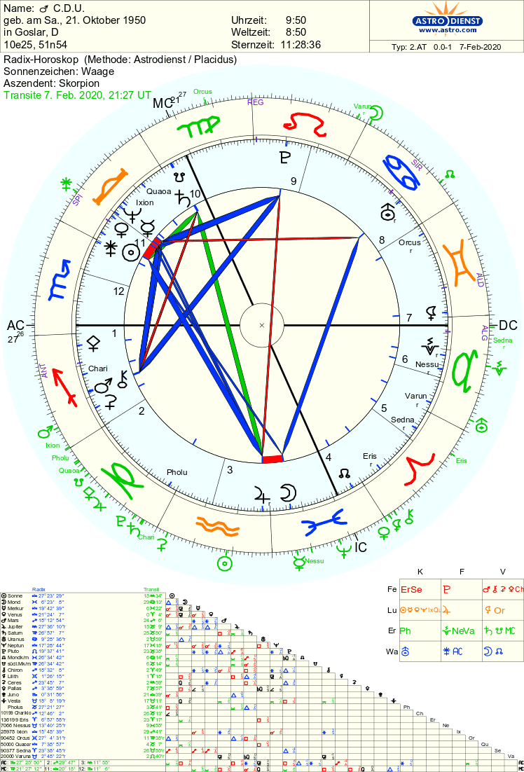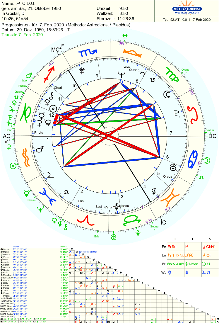 Der ‚Herzinfarkt‘ wird wohl in Kürze aktuell (Mars Konj. Sonne p Opp. Uranus p 27.02., wirkt ab 24.). Das sind dann auch geheimdienstliche Aktionen (Sonne H7 in 12), und danach sollte dann auch der CDU-Einfluß auf die Medien gestoppt bzw. bereinigt werden (Mars Konj. Merkur p + Venus p 08. - 14.03.). All das kann theoretisch geheim ablaufen (weil in Haus 12), wir werden es vielleicht erst zu hören bekommen, wenn Saturn den AC p erreicht (ab 23.03.).
