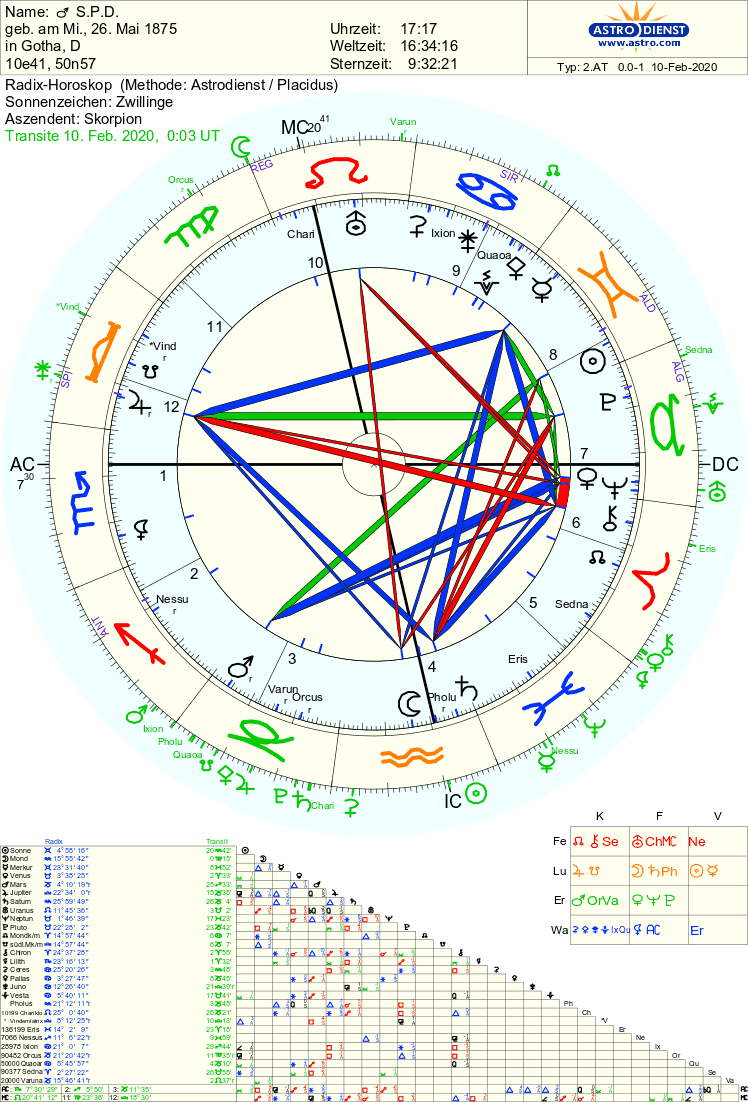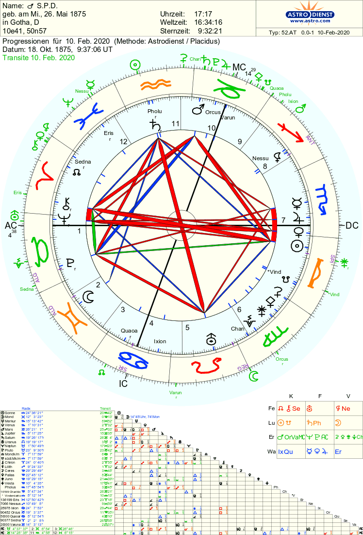 Das eigentliche Problem ist jedoch, daß die SPD mit einer Intention angetreten ist, falsche geistige Werte im Bewußtsein zu verankern (Skorpi- on-AC, Pluto H1 in 7 im Stier). Das mag ihnen nicht bewußt gewesen sein, aber es reicht, wenn Kräfte hinter den Gründern diese Absicht hatten, und wir wissen heute, daß es diese Kräfte auch damals schon gab. Mit dieser Ideologie wurde nicht nur das Volk geistig unter Druck gesetzt, sozusagen falsch programmiert (Pluto Qu. Mond), sondern es ist auch das Thema der Fremdbestimmung erkennbar, was bereits darauf abzielte, das Volk den Traditionen und Wurzeln zu ent- fremden (Pluto Qu. Saturn).