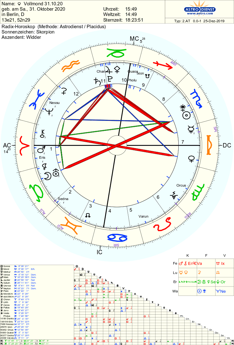 Recht ungewöhnlich, aber sehr passend: es geht in diesem Vollmond um unsere Selbstdurchsetzung (Widder-AC), und zwar in scharf betonter Weise (Mars H1 Konj. AC). Da Mars noch ← ist, sind wir noch nicht in unserer vollen Kraft, viele zögern aus Angst, und es gilt auch noch, das Geschehene aus den letzten Monaten aufzuarbeiten, und sich auch über die spätere Handlungsweise klar zu werden. Dieser Zustand hält bis Mitte November an, bis Mars am 14.11. seine Station auf 15° Widder hat und umdreht. Dann gilt es jedoch, aktiv zu werden, und zwar gegen die unsere Freiheit einschränkende Regierung (Mars Qu. Saturn H10 + H11 in 11). Ich schreibe das nicht, um eine Revolution zu befürworten, sondern ich übersetze nur die Konstellationen. Man kann Vieles tun, und jeder ist hier angesprochen, im Rahmen seiner Möglichkeiten dazu beizutragen. Bestes Beispiel ist