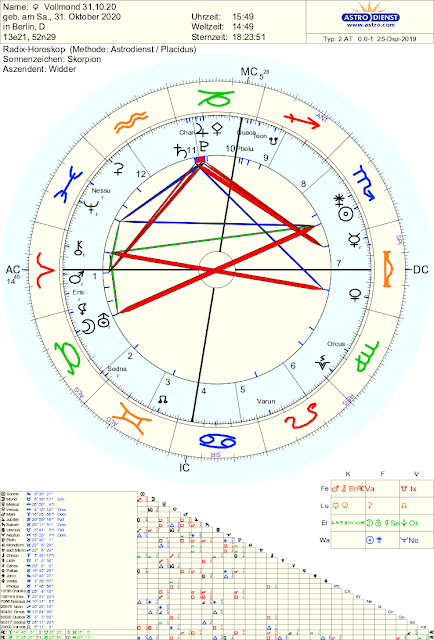 Es sind ja nicht nur die Hauruck-Verordnungen - die nichtmal durch den Bundestag legitimiert sind - sondern es wird ja der Zwang der Executive gleich mit angedroht (Pluto H8 in 10 Konj. Saturn). Dies ist ein unhaltbarer Zustand aus Sicht des Himmels, gegen den wir aufgefordert sind, etwas zu unternehmen - friedlich wenn möglich - allerdings sieht es nicht ganz danach aus. Denn die Regierung wird versuchen, solche Durchsetzungsinitiativen zu stoppen (Saturn H10 Qu. Mars), was ihr nebenbei gesagt, nicht gelingen wird, denn Mars erreicht das Quadrat zu Saturn erst Mitte Januar, und dann kann die Lage bereits eine ganz andere sein.