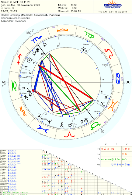 So hat die Mondfinsternis am 30.11. mit dem Ermächtigungsgesetz bereits im Voraus gewirkt. Es geht diesmal um Verantwortung und Selbstbestimmung (Steinbock-AC), und zwar für uns selbst (Saturn H1 in 1). Diese Selbstbestimmung wird uns nun verweigert, indem uns von der Regierung eine Fremdbestimmung übergestülpt wird (Pluto H10 Konj. Saturn in 1), die jegliche Freude und Leichtigkeit unterdrückt (Pluto Konj. Jupiter + Chariklo). Dies ist ein Thema, das ausführlich im Artikel ‚