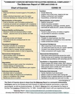 Um das zu verstehen, werfen Sie einen Blick auf untenstehende Tabelle, die uns ein aufmerksamer Leser unseres Newsletters geschickt hat. Sie vergleicht die derzeitige Covid-19-Kampagne mit den Methoden, die von den kommunistischen Chinesen benutzt wurden, um amerikanische Gefangene während des Koreakrieges gehirnzuwaschen.
